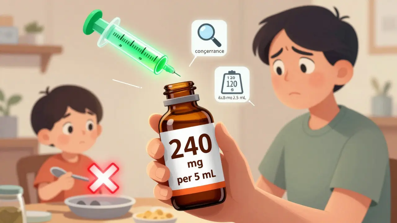 It means every 5 milliliters of the liquid contains 240 milligrams of the active drug. If your dose is 120 mg, you need to give half of that volume: 2.5 mL. Always calculate the dose based on the concentration, not the total bottle size.