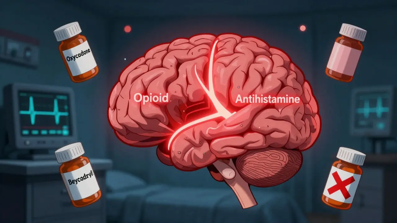 Many people don’t realize that a common allergy pill can turn a prescribed painkiller into a life-threatening mix. Taking opioids like oxycodone or hydrocodone with over-the-counter antihistamines like diphenhydramine (Benadryl) or hydroxyzine (Atarax) doesn’t just make you sleepy-it can slow your breathing to a dangerous level, even stop it. This isn’t a rare accident. It’s a well-documented, preventable risk that kills people every year.
